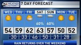 | FIRST ALERT: Tracking weekend rain chances Fortunately, I am not seeing any signs of severe weather in the forecast. Rain chances will climb to around 70-percent after dark Saturday and continue through at least Sunday morning. The rain chances should taper off during the afternoon Sunday with some clearing expected. Highs this weekend will ...
